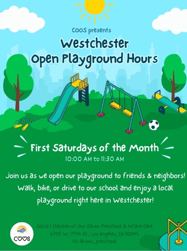 We open up our playground to the Westchester community every First Saturday of the month. Come hang out at our beautiful playground and meet other families in the neighborhood!
